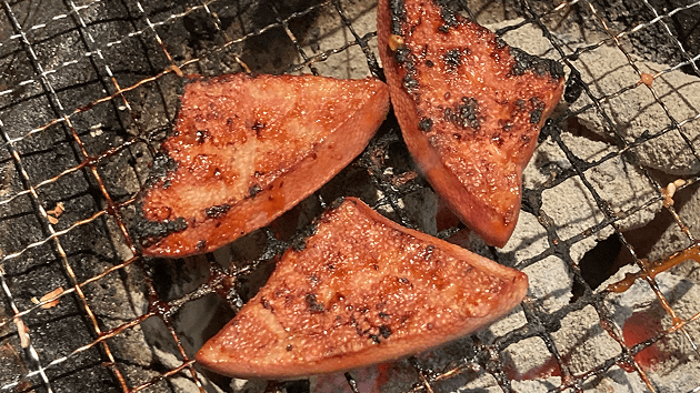 - 表面が少し反り始めたらひっくり返す。その後は小まめにひっくり返しながら、ほどよい焼き色がついたら食べ時。