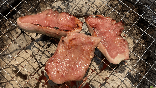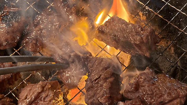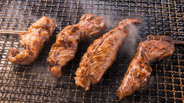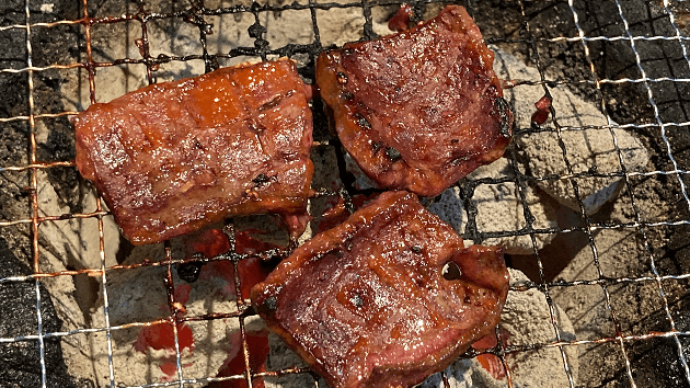 - 壺漬けハラミは一本丸ごと焼き、火が7.8割通ったらハサミでお好みの大きさにカット!