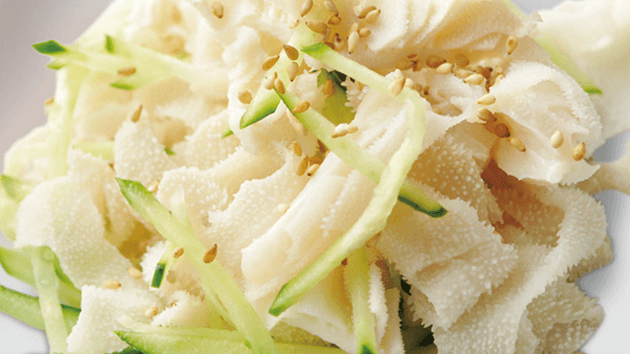 - 伊藤課長では、臭みのある表面の黒い皮を丁寧に剥いだ、冷たい白センマイ刺しをご用意しています。必食です!